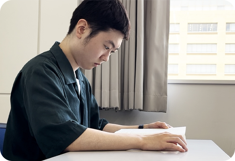 私は普段、講義の空き時間は図書室で自習します。当然ですが、とても静かな環境で集中することが出来るので、自習には最適な環境だと思います。学生証があれば本を借りることもできるので、有効活用すると良いでしょう。この日はちょうど資格試験の勉強をしていました。情報学部には「寺子屋」という学習指導員の先生に学習に関する相談ができる場所があり、丁寧に教えてくださるので空き時間での利用もお勧めです。