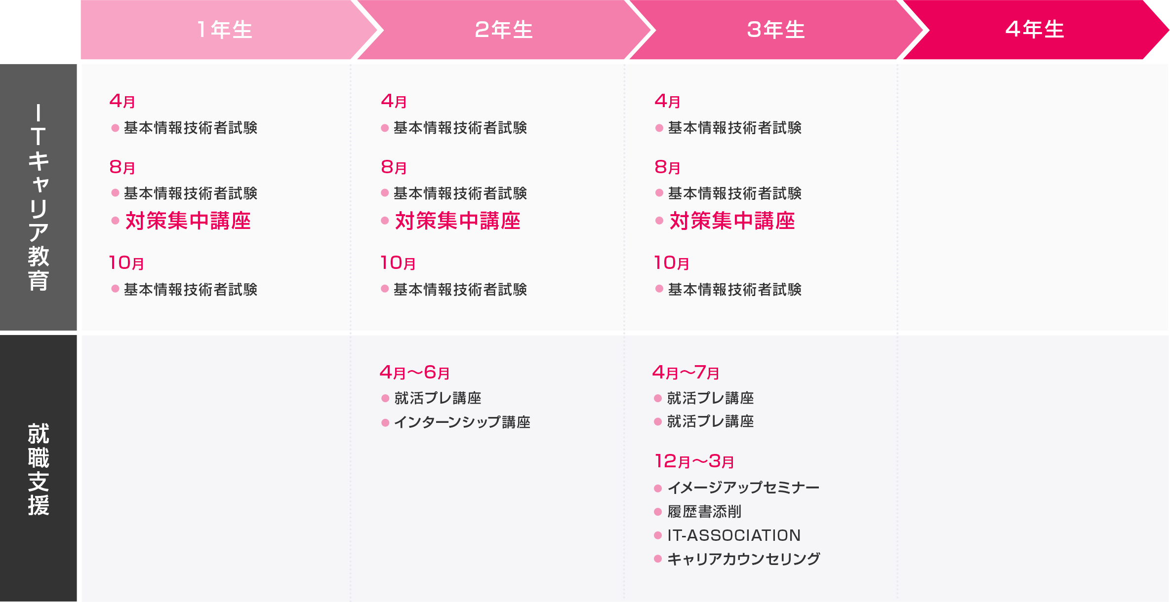 大学の授業で得られた情報技術の知識の上に、IT資格取得をはじめとする「テクニカルスキル」と実社会で求められるコミュニケーションをはじめとする「ジェネリックスキル」を養成し、IT業界に必要とされる人材を育成します。
