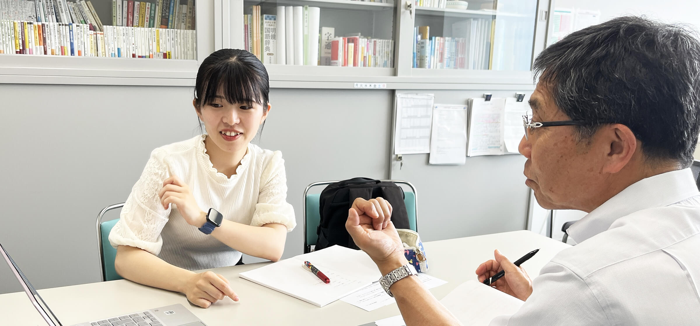 情報学部では、専属の教職課程相談員が、論作文の書き方を含む試験勉強や教育実習に関するアドバイスを行い、教員免許取得に向けてあらゆる面で学生のサポートをしています。